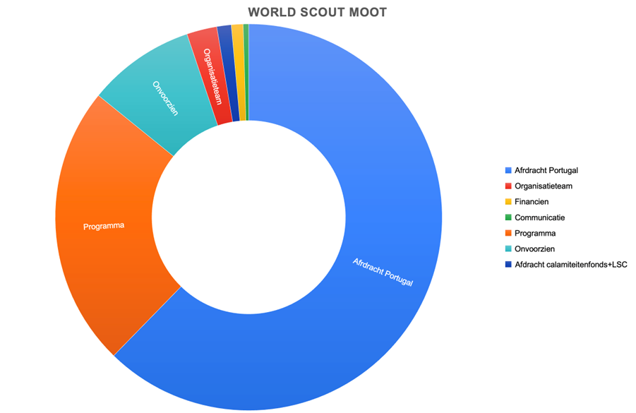 Hoe de kosten verdeeld zijn kun je hieronder in het overzicht zien. De afdracht naar de Portugese organisatie is de grootste kostenpost, het programma (incl. kledingpakket) daarna. De post onvoorzien is de volgende grote post. Deze post is er om alle tegenvallers op te vangen en is een verplichte post in onze begroting. De laatste vier posten zijn de vaste kosten voor de organisatie, communicatie en afdracht aan het calamiteitenfonds en LSC (Landelijk service centrum van Scouting Nederland). Als er meer deelnemers/IST’ers meegaan dan zullen de vaste posten min of meer gelijk blijven en de posten voor afdracht, programma en onvoorzien zullen schalen met het aantal deelnemers.